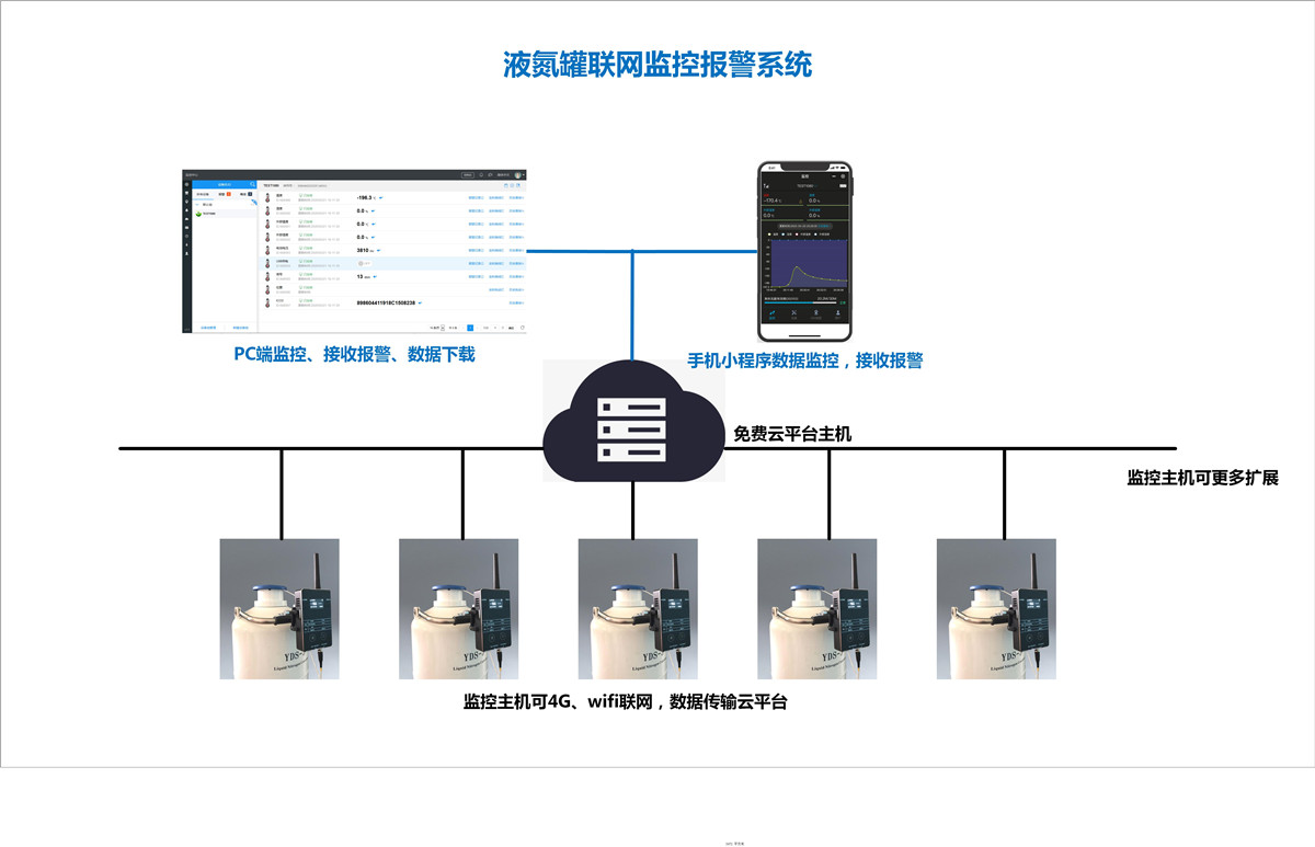 液氮罐聯(lián)網(wǎng)監(jiān)控系統(tǒng)是一套采用Edge Meter系列監(jiān)控設(shè)備BD-200A液氮罐超低溫監(jiān)控儀利用物聯(lián)網(wǎng)監(jiān)控模式對(duì)液氮罐液位進(jìn)行液位監(jiān)控的一體化監(jiān)控系統(tǒng)。該系統(tǒng)具有操作方便,手機(jī)小程序和PC端都可監(jiān)控液氮罐溫度及接收低液位監(jiān)控報(bào)警。系統(tǒng)可提供電壓報(bào)警,適合遠(yuǎn)途運(yùn)輸型液氮罐使用。一體化液氮罐聯(lián)網(wǎng)監(jiān)控系統(tǒng)只用一部手機(jī)即可監(jiān)控N臺(tái)液氮罐,接收液位報(bào)警信息。并使用PC端平臺(tái)下載溫度記錄。主機(jī)能夠24小時(shí)全天候在線工作。